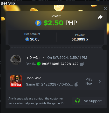 Crash x99 .05 https://hash.game/#/sd/124NMZ6TN1T0CR JOHNWILD x50 https://hash.game/#/sd/124NO3APWVOK23 Buy at least 25 lottery tickets and place a bet on the lottery SPORTBET 1.5x ODDS 1USD BET TICKET ID: 2432895037160431791 DEPOSIT 20USD WAGER 2000USD