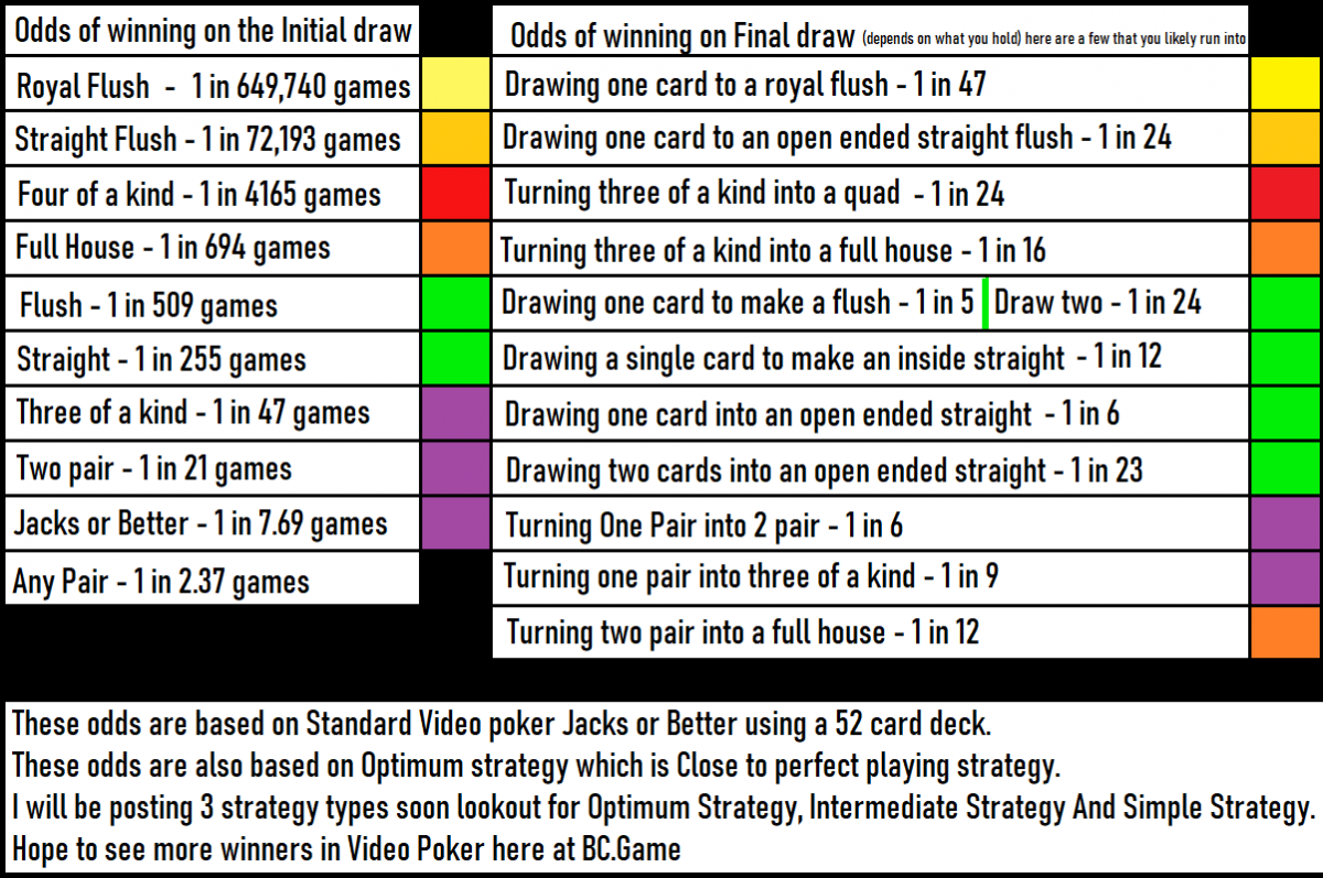Monstrous Eberto Posted August 13, 2020 Share Posted August 13, 2020 trying to Translate? copy and paste what's typed below; Odds of winning on the initial draw. Royal Flush - 1 in 649,740 games Straight Flush - 1 in 72,193 games Four of a Kind - 1 in 4165 games Full House - 1 in 694 games Flush - 1 inn 509 games Straight - 1 in 255 games Three of a Kind - 1 in 47 games Two Pair - 1 in 21 games Jacks or Better - 1 in 7.69 games Any Pair - 1 in 2.37 games Odds of winning on final draw (depends on what you hold) here are a few that you likely run into: Drawing one car to a royal flush - 1 in 47 Drawing one card to an open ended straight flush - 1 in 24 Turning three of a kind to A Quad - 1 in 24 Turning three of a kind into a full house - 1 in 16 Drawing one card to make a flush - 1 in 5 / Draw two - 1 in 24 Drawing a single card to make an inside straight - 1 in 12 Drawing one card into an open ended straight - 1 in 6 Drawing two cards into an open ended straight - 1 in 23 Turning one pair into two pair - 1 in 9 Turning two pair into a full house - 1 in 6 These odds are based on Standard Video poker Jacks or Better using a 52 card deck. These odds are also based on Optimum strategy which is Close to perfect playing strategy. I will be posting 3 Strategy types soon lookout for Optimum Strategy, Intermediate Strategy, And Simple Strategy. Hope to see more winners in Video Poker here at BC.Game Link to comment Share on other sites More sharing options...