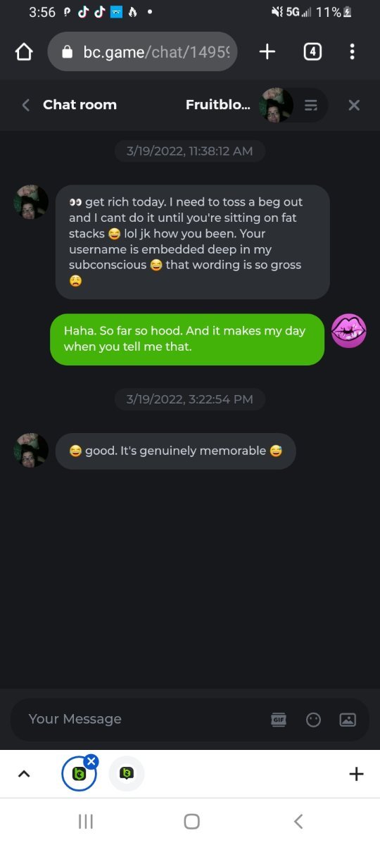 My most memorable moment at bc was a couple months after I was permabanned. I always kept an eye on chat for coindrops. When I saw a little blue chat bubble pop up. Now I know that's not surprising to anyone who hasn't been muted before. But it meant I was just tagged by someone. So I opened the chat and saw it was a user named FruitBlood giving me the award for grossest username she's ever read. And how she can't forget it. It still the greatest moment in my bc career.